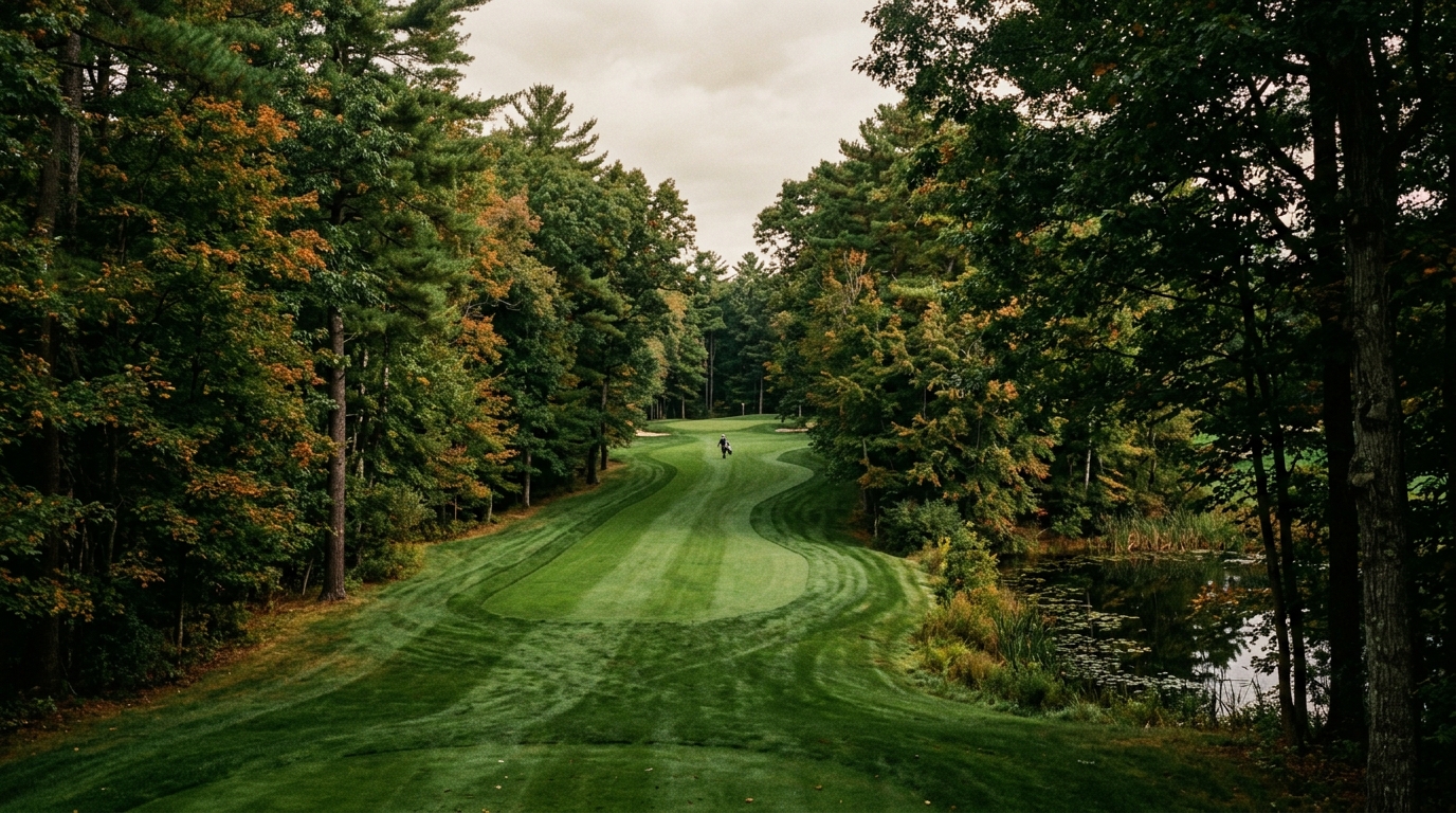 Tight is not an exaggeration. The fairways are narrow and the trees are mature. Every hole demands a decision about where you're going to miss, because the fairways don't give you much room to just “hit it somewhere on there.” Water compounds the pressure — Wheeler Pond and its surrounding wetlands frame approaches on roughly nine holes.