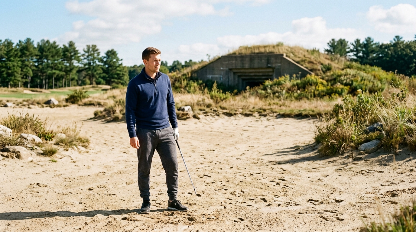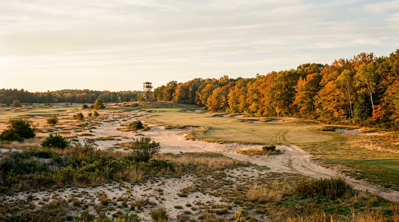 The land does a lot of the work. Fort Devens was a U.S. Army installation, and Silva used what was there: old military ammunition bunkers repurposed as design features on hole 17, a military lookout tower from the Fort Devens era still standing at the 18th tee. The ground lease is held by MassDevelopment. The whole property has a specificity that courses built on generic subdivision land can't manufacture.